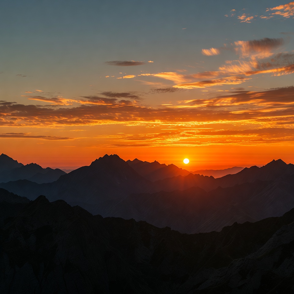 alpine, blue sky, clouds, dramatic, dusk, golden hour, horizon, landscape, layered mountains, mountain range, mountains, nature, orange sky, outdoor, peaks, ridges, scenery, scenic view, silhouette, sky, sun, sunset glow, vibrant, sunset