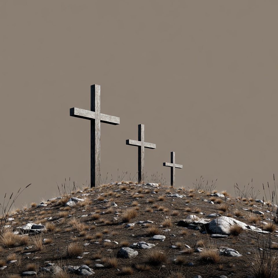 3D render, Calvary, Christian symbol, Golgotha, beige sky, crosses, dry grass, grassy hill, hill, isolated background, religious, rocky hill, stones, wooden crosses, three crosses