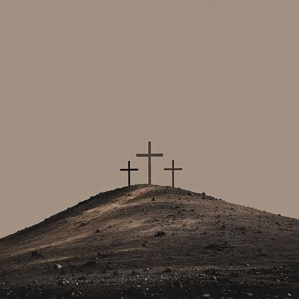 Calvary, Christian symbol, Easter symbol, Golgotha, barren hill, beige sky, crosses, crucifixion site, faith symbol, hazy background, hill, landscape, minimalism, outdoor scene, religious icon, sandy ground, sepia tone, silhouette, wooden crosses, three crosses