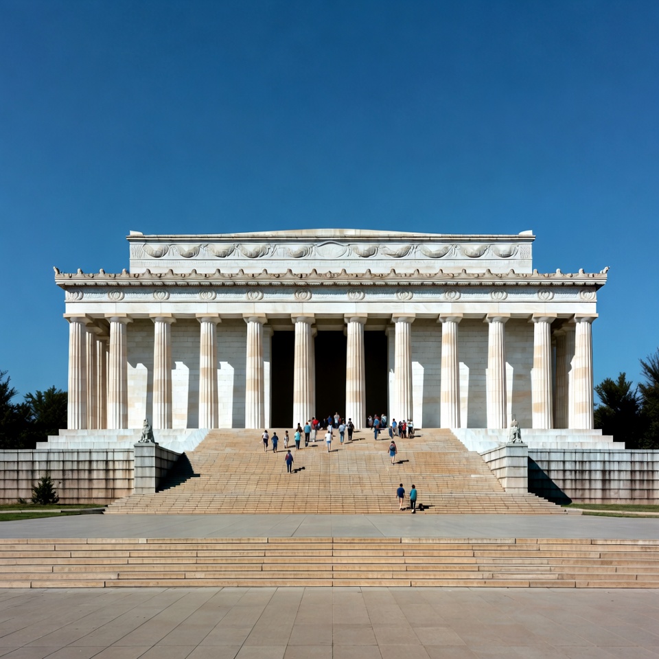 Asian, Latino, Multiracial, Washington DC, White, architecture, blue sky, columns, female, grass, historic site, landmark, male, marble, monument, neoclassical, palm trees, people, statues, steps, tourists, Lincoln Memorial