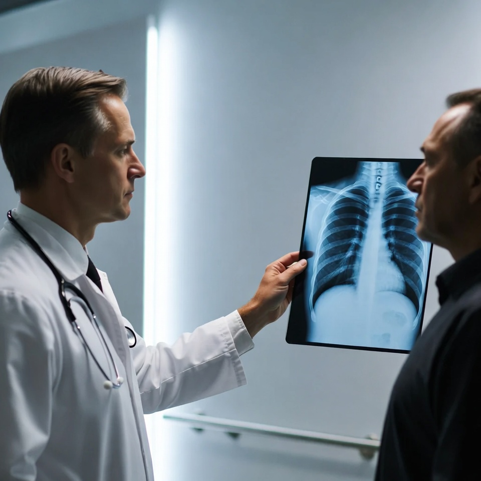 A male doctor in a white coat and stethoscope holds up a chest x-ray film to a male patient in a medical room. The x-ray clearly displays the patient's ribcage and lungs. Both men face each other with focused expressions under bright fluorescent lighting.