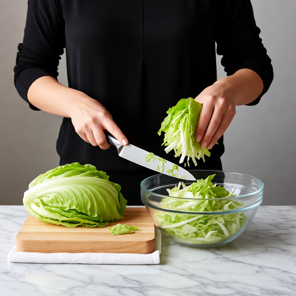 A woman with long dark hair wears a black top while chopping a head of green lettuce with a knife over a wooden cutting board. Shredded lettuce pieces fall into a clear glass bowl beside the intact lettuce head. The scene is set on a white marble countertop with a cloth nearby.