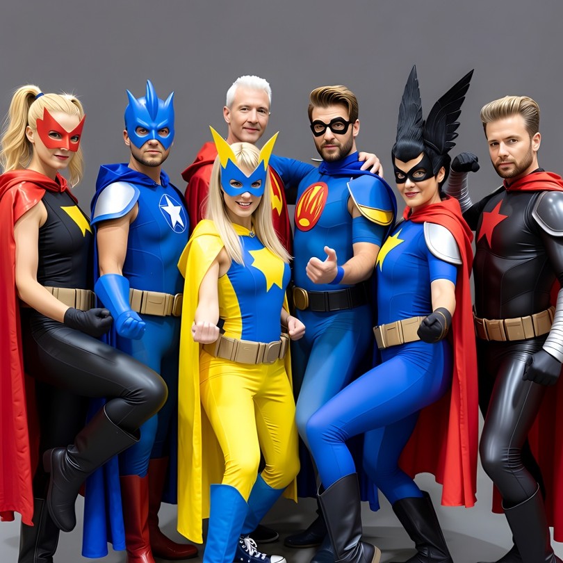 Six adults dressed in colorful superhero costumes pose together on a gray background. The group includes women in red, yellow, and black outfits with masks and capes, and men in blue, black, and red suits with helmets and accessories. They stand confidently with dynamic poses, featuring blonde ponytails, silver hair, and various masks.