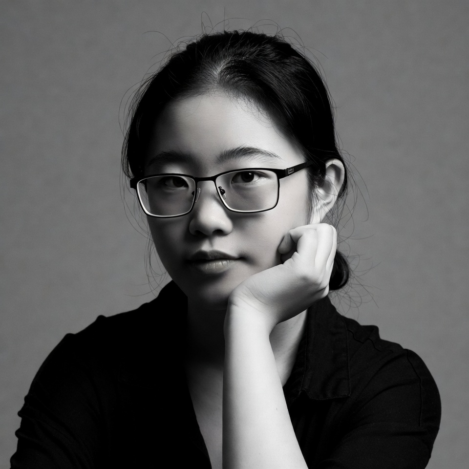 A young Asian woman with straight black hair and black-framed glasses gazes at the camera. She rests her hand on her chin in a thoughtful pose, wearing a black top. The image is a black and white portrait against a plain gray background.
