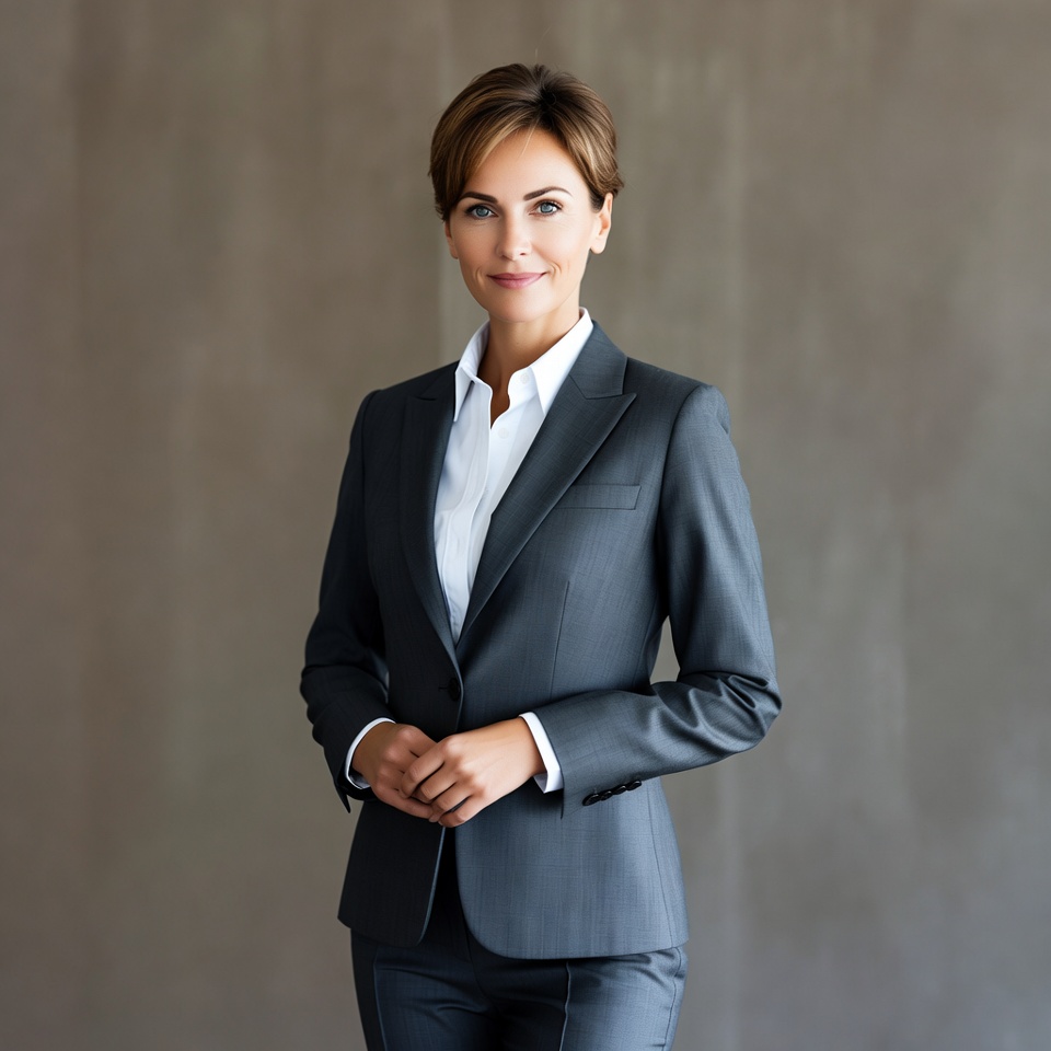 A woman with short brown hair stands confidently against a gray background. She wears a tailored gray suit jacket, white collared shirt, and matching pants. Her hands are clasped in front of her.