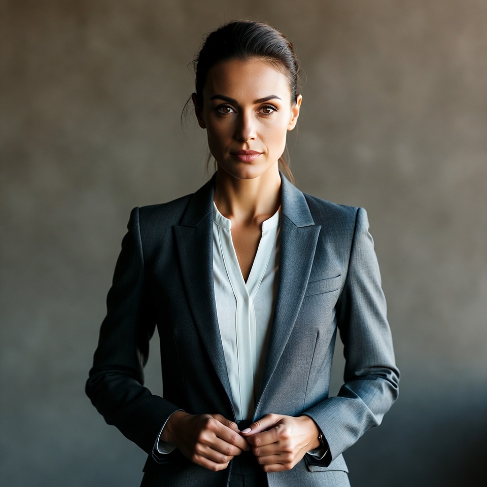 A young woman with dark hair in an updo stands confidently against a gray background. She wears a tailored gray suit jacket over a white collared blouse and adjusts her jacket with both hands. Her expression is poised and direct, facing the camera.