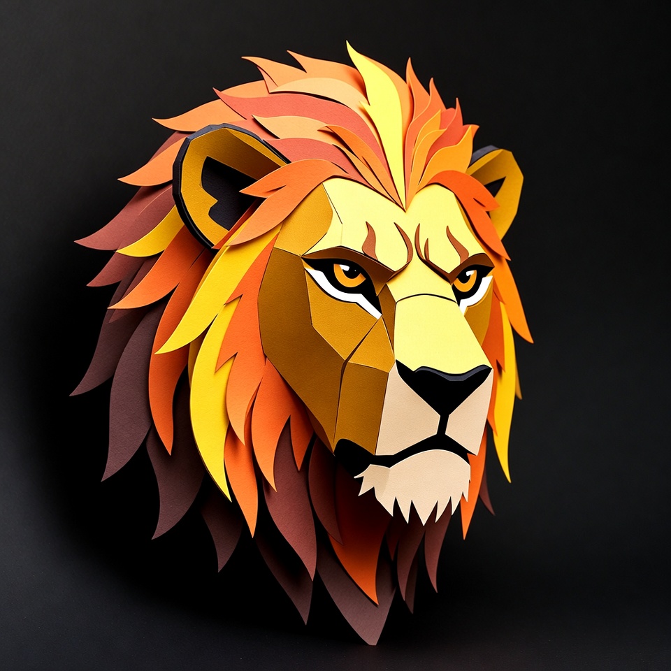 A detailed papercraft lion head in profile view features layered paper cutouts in vibrant yellow, orange, and brown tones. The mane flows dynamically with fiery hues, and the fierce eyes and snout are sharply defined. It is isolated against a solid black background.