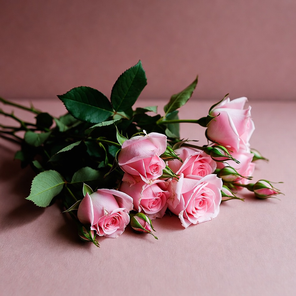 bloom, bouquet, closeup, floral, floral bunch, flower arrangement, flowers, fresh flowers, garden flowers, green leaves, isolated background, nature, petals, pink background, pink flowers, plant, romantic flowers, rose buds, rose cluster, roses, soft light, stems, vibrant, pink roses