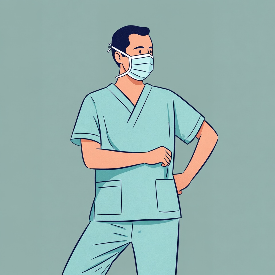 Asian, cartoon doctor, clipart, confident pose, face mask, hands on hips, healthcare worker, illustration, isolated background, light blue scrubs, male, man, medical uniform, scrubs, side view, standing pose, surgical mask, vector art, white mask, doctor