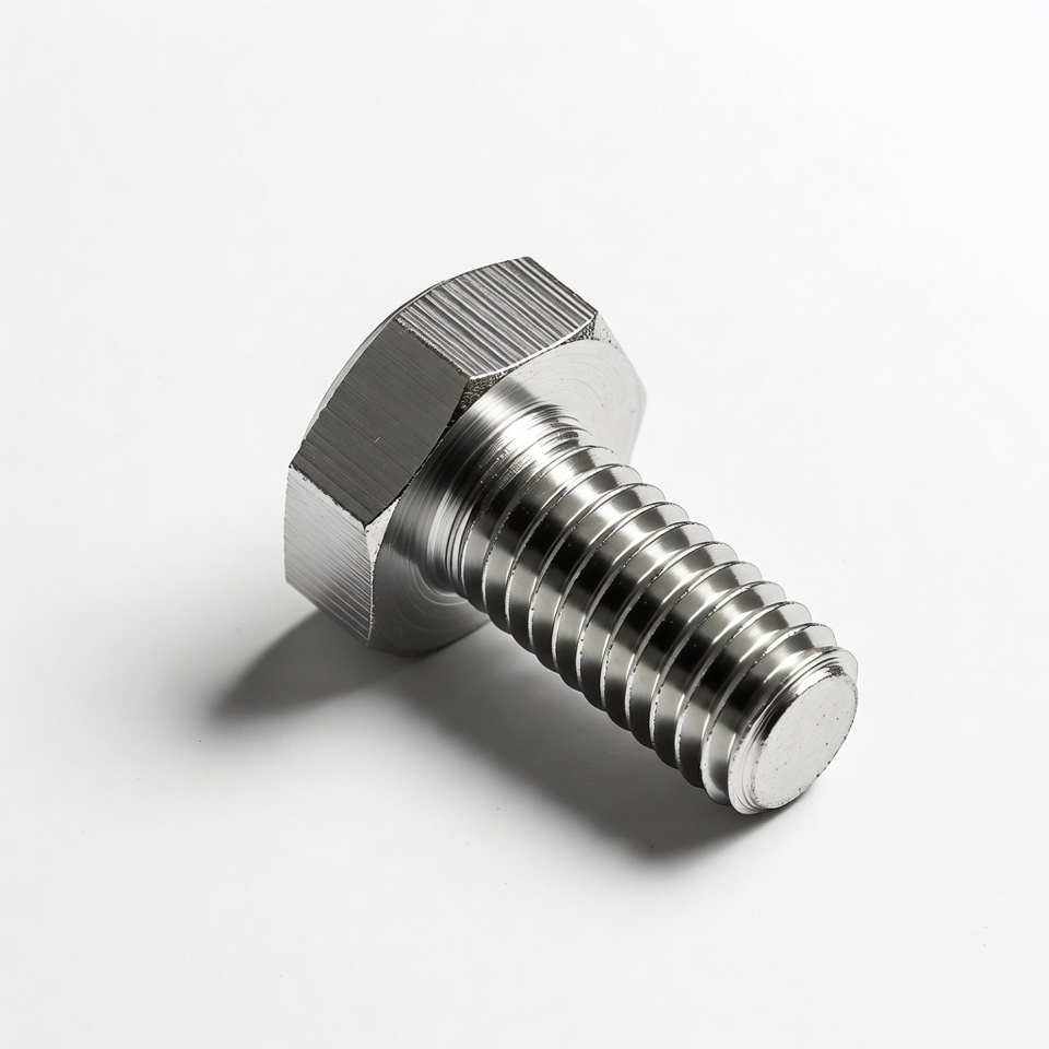 A metallic hex bolt with a shiny silver finish lies on a plain white surface. The bolt features a six-sided head and threaded shaft, casting a subtle shadow.