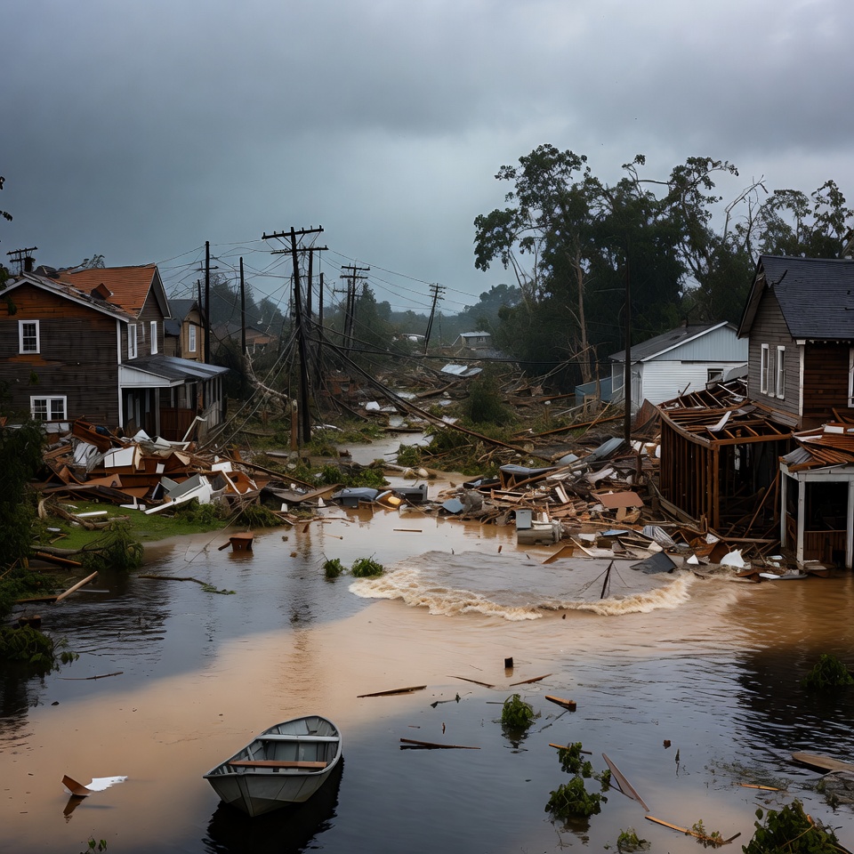 aftermath, boat, brown water, cloudy sky, damaged homes, debris, disaster, flooded street, flooding, floodwater, houses, hurricane damage, overcast, power lines, residential area, rowboat, storm destruction, uprooted trees, utility poles, vegetation, water, wood debris, wreckage, flood