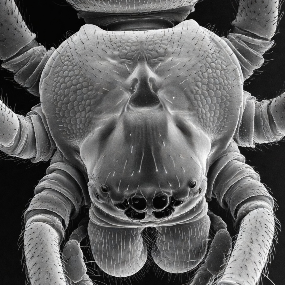 SEM image, arachnid, black background, cephalothorax, chelicerae, close-up, detailed texture, electron microscope, hairs, insect-like, isolated, macro photography, pedipalps, spider eyes, spider face, spider legs, wildlife, spider