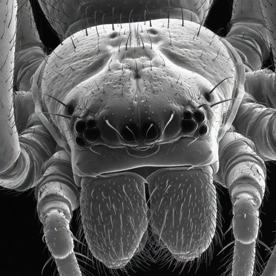 SEM, arachnid, arthropod, black background, cephalothorax, chelicerae, close-up, detailed, eyes, face, fangs, hairs, insect-like, isolated, legs, macro, microscope, pedipalps, texture, wildlife, spider