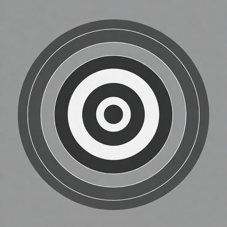 A simple graphic features a central white dot surrounded by alternating black and gray concentric circles. The design forms a classic bullseye pattern on a light gray background. Multiple rings decrease in thickness outward from the center.