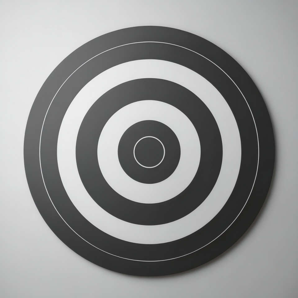 A circular black and white target with concentric rings is centered on a plain gray background. The design features alternating black and white bands, with a small central white circle. It appears as a 3D rendered graphic.