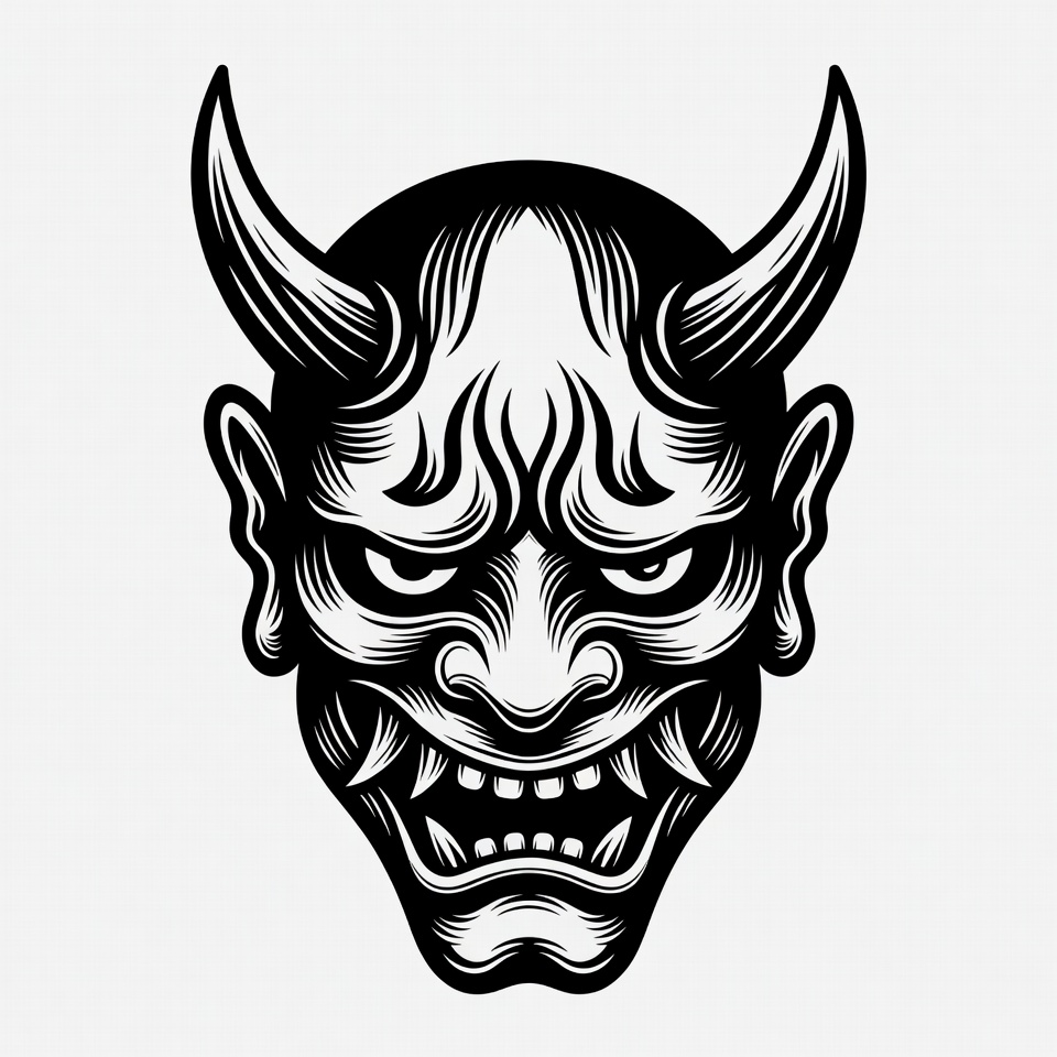 Asian demon, Hannya mask, Japanese Oni, angry expression, black and white, demon face, demon mask, fangs, fierce eyes, graphic art, horns, illustration, ink drawing, isolated background, line art, mythical creature, tattoo design, traditional Japanese, yokai, Oni mask