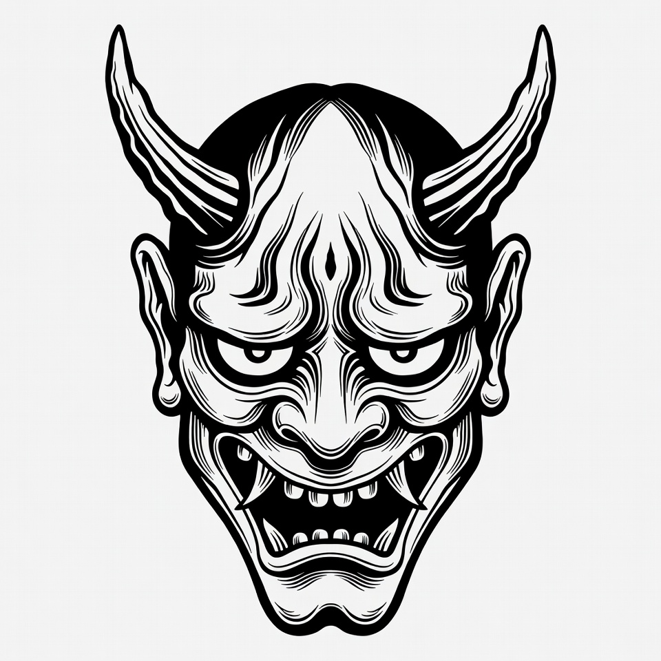 Japanese demon, Noh mask, Oni mask, angry demon, black and white, clipart, demon mask, fangs, fierce eyes, graphic design, horns, illustration, isolated background, line art, mythical creature, snarling mouth, tattoo design, traditional Japanese, vector art, Hannya mask