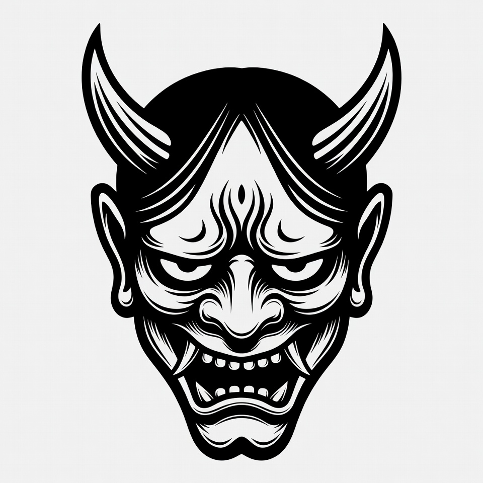 Asian demon, Japanese demon, Oni, black and white, cultural mask, demon mask, devil mask, fangs, fierce face, graphic design, horns, illustration, isolated background, line art, scary mask, tattoo design, traditional Japanese, vector art, yokai, Oni mask