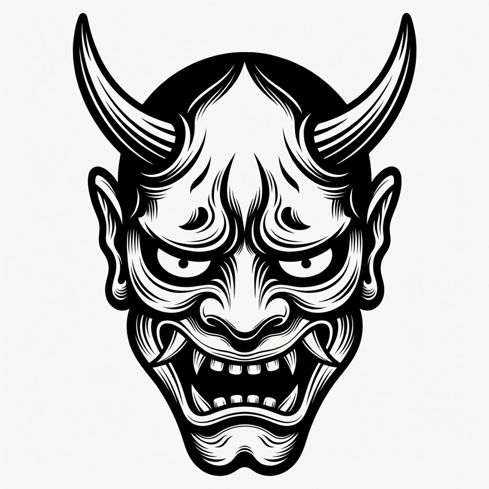 Japanese demon, Oni, angry face, black and white, clipart, curved horns, demon mask, evil demon, fangs, fierce eyes, glaring eyes, horns, illustration, isolated background, line art, mythical creature, pointed ears, sharp teeth, tattoo design, traditional Japanese, vector art, Oni mask