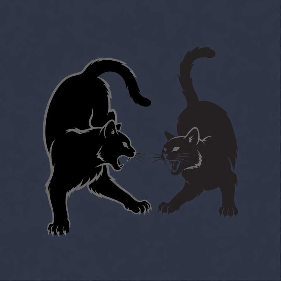 A black silhouette illustration of two snarling cats facing off aggressively against each other. They have arched backs, raised fur, and extended claws on a solid navy blue background. The design is simple and bold with white outlines highlighting their fierce expressions.