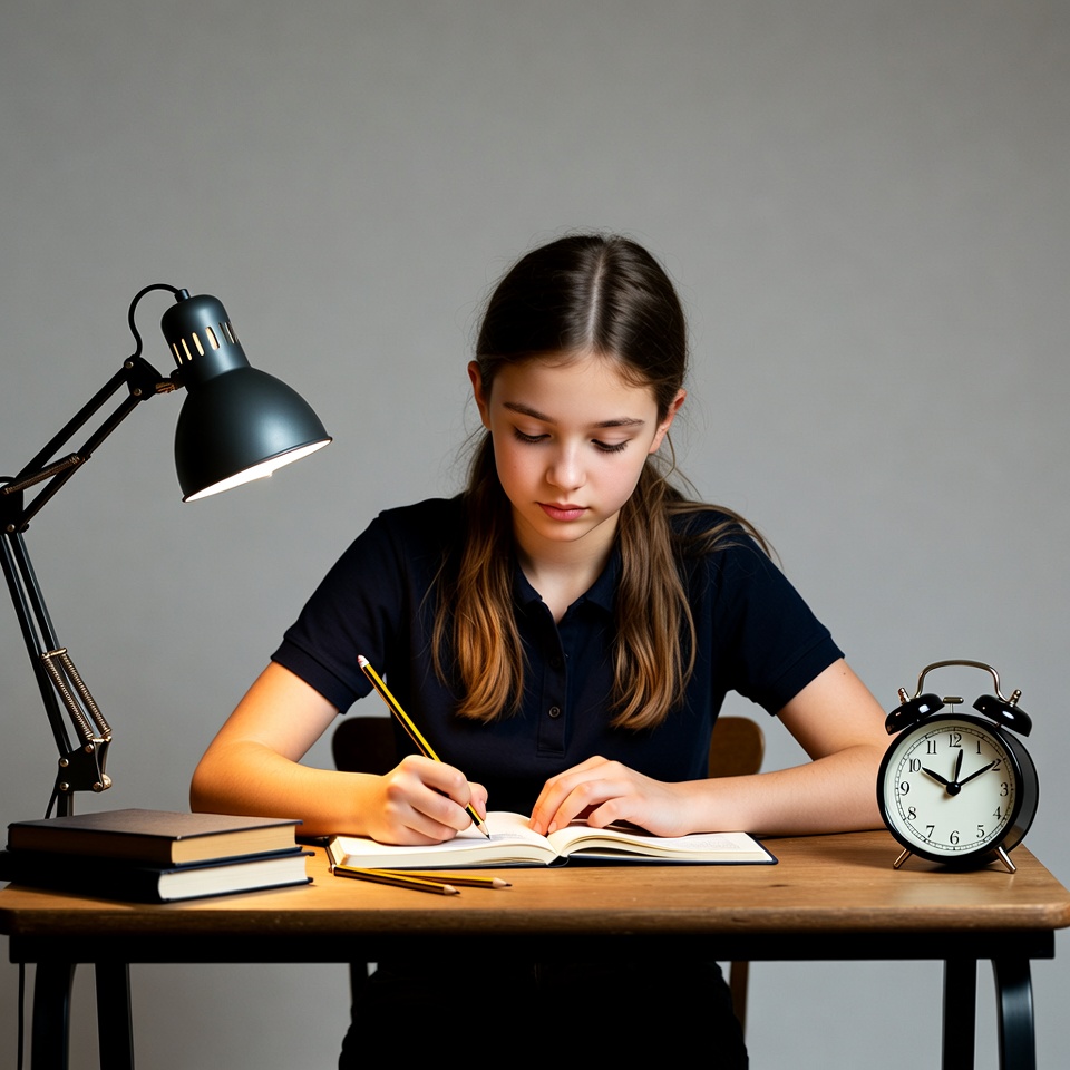 A young girl with brown hair in a ponytail sits at a wooden desk, writing in an open notebook with a pencil. She wears a dark blue polo shirt and is focused on her work under a desk lamp. A clock and stacked books are on the desk against a plain gray background.