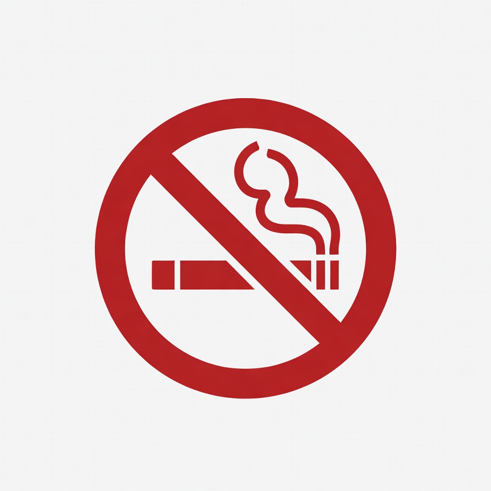 A red circular prohibition sign features a cigarette with smoke crossed out by a diagonal slash. The icon is bold and simple against a white background. It clearly indicates a smoking ban.