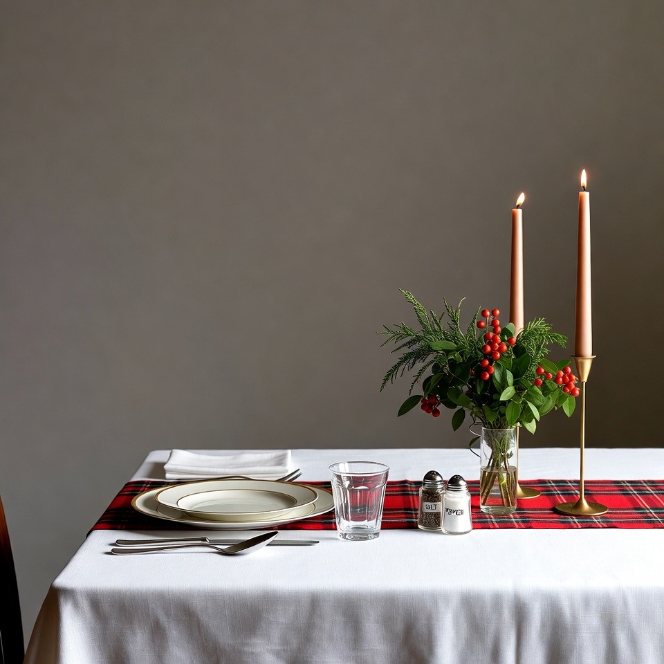 A festive table features a white plate on a red and green plaid runner. Two lit beige candles in gold holders flank a glass vase of fir branches and red holly berries. A clear glass, salt and pepper shakers, and white napkin complete the elegant holiday setup on a white tablecloth against a gray background.