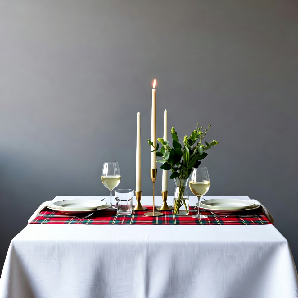 candelabra, candlelit dinner, centerpiece, dinnerware, elegant dining, eucalyptus flowers, festive setup, glassware, gold candle holder, green branches, holiday table, isolated background, lit candles, place setting, red plaid runner, romantic table, table setting, tablecloth, white plates, white tablecloth, white wine, wine glasses, dinner table