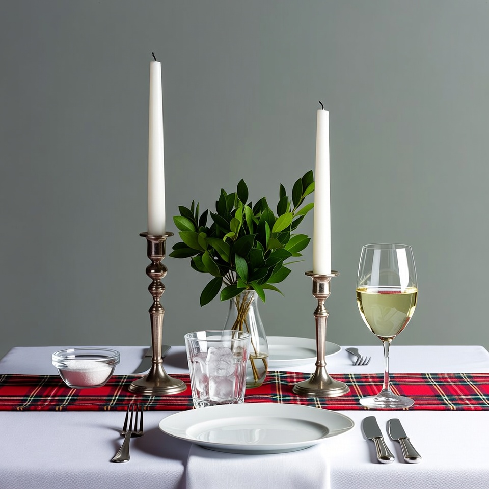 A dining table is set with two tall white candles in silver candelabras, flanked by a glass of white wine and a glass of water. Green leafy branches stand in a small vase between the candles. The table features a red plaid table runner, white plates, cutlery, and a small bowl of salt on a gray background.