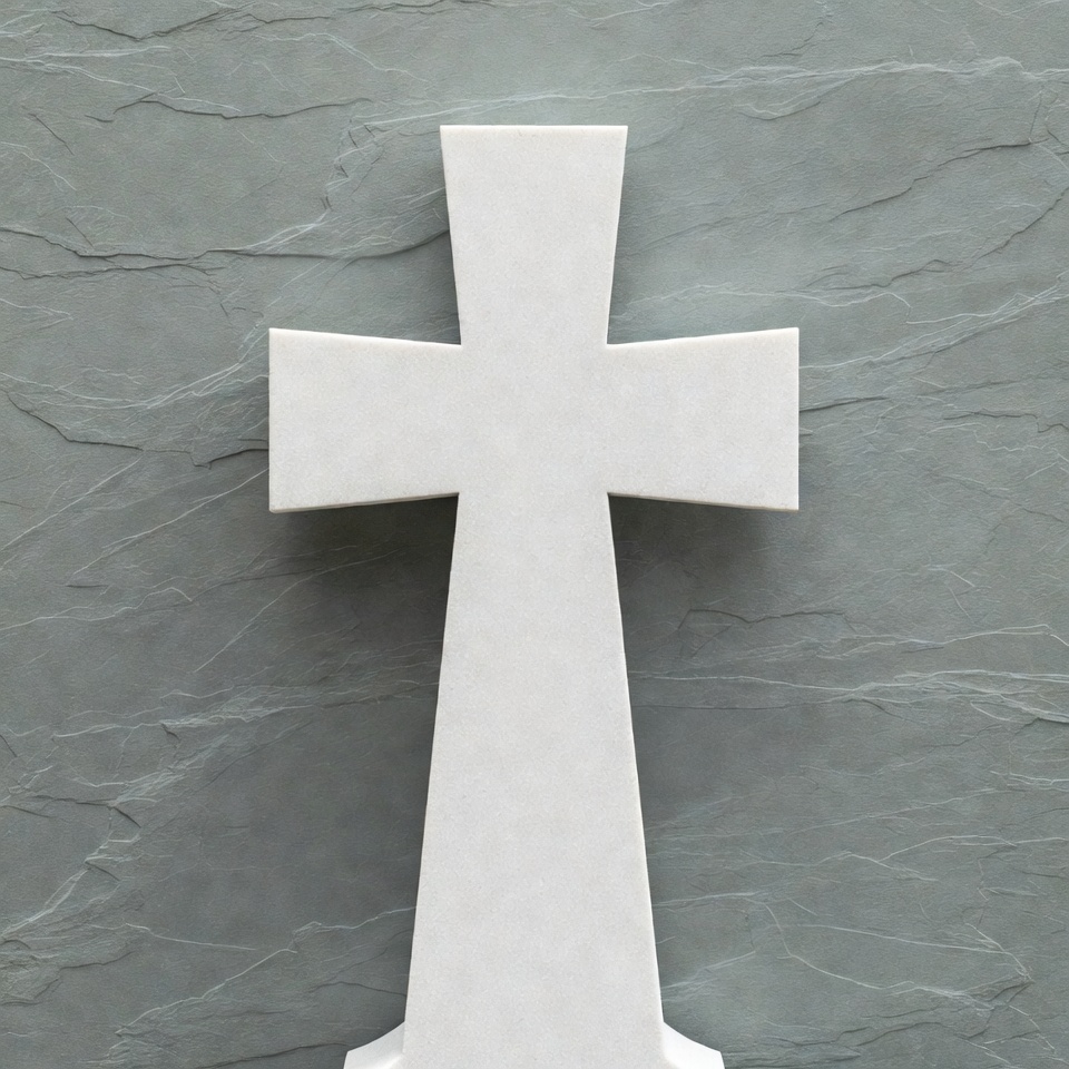 A white Latin cross stands prominently against a textured gray stone wall. The cross has clean, angular edges and a smooth marble-like finish. It is centered and isolated on the neutral background.