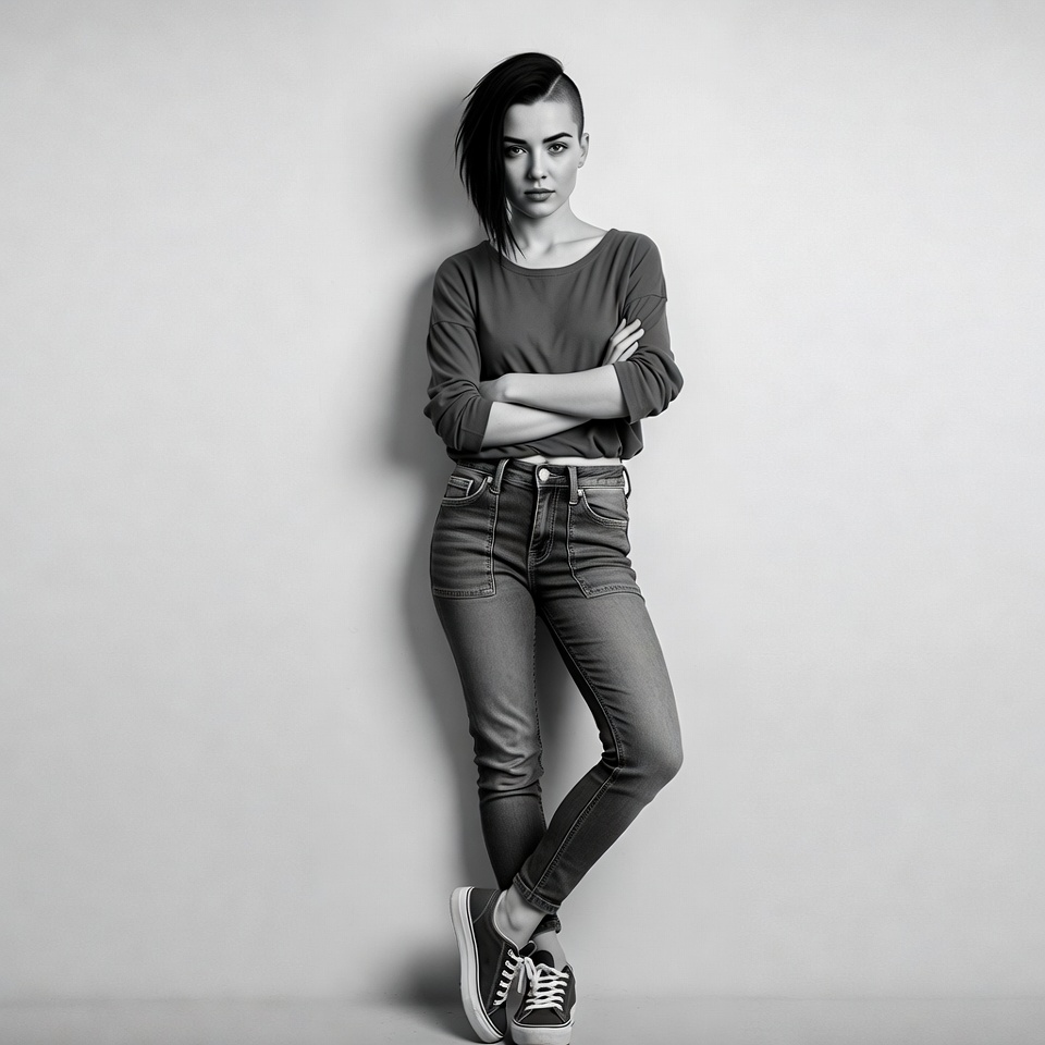 A young woman with a black undercut hairstyle and striking eyes stands with arms crossed against a plain white wall in black and white. She wears a loose long-sleeve top, slim-fit jeans, and white sneakers with black laces. Her pose is confident with one leg slightly bent.