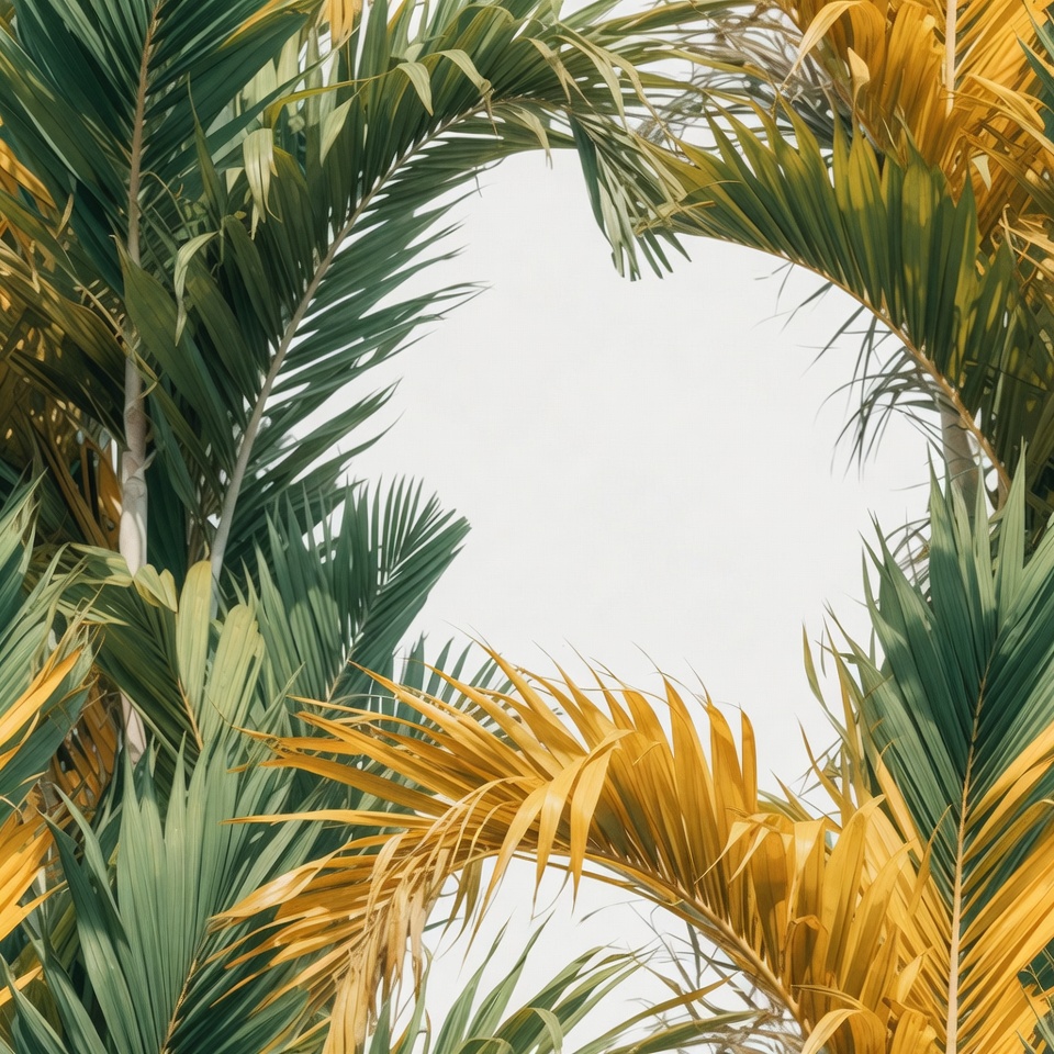 Vibrant areca palm leaves in green and yellow hues frame a central white space. The fronds curve elegantly around the isolated background. This tropical plant arrangement features detailed textures and rich colors.