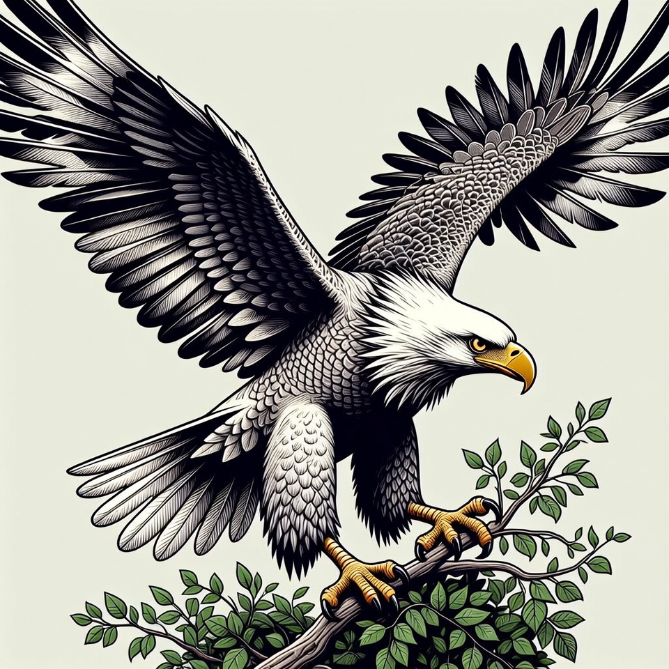 avian, bird, eagle, feathers, green leaves, illustration, isolated background, majestic, perched, raptor, talons, tree branch, wildlife, wings spread, yellow beak, bald eagle