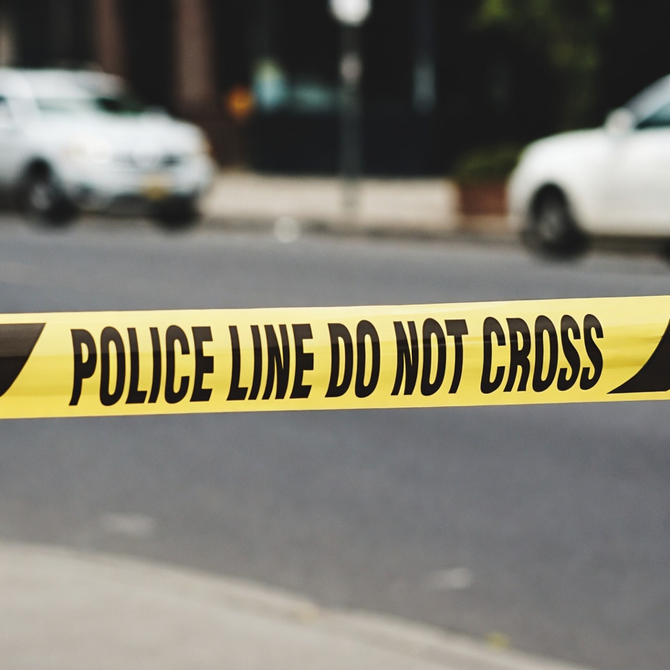 Yellow police line do not cross tape stretches across a blurred urban street scene. White cars and buildings are visible in the background with soft lighting. The bold black text on the tape is clearly readable against the yellow background.