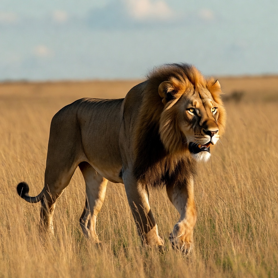 A majestic male lion with a thick dark mane walks through tall golden grass in the savanna. The sky above is partly cloudy with warm sunlight illuminating the scene. The lion gazes forward intently with its tail raised.