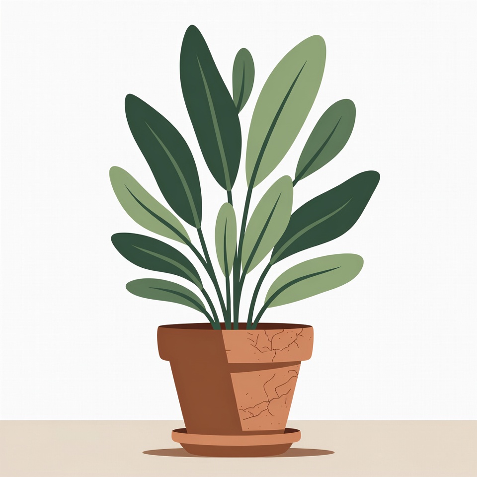 A vibrant illustration of a tall green plant with long, pointed leaves growing in a terracotta pot. The pot has a cracked texture and sits on a simple beige surface with a matching saucer. The plant features multiple overlapping leaves in shades of green against a white background.