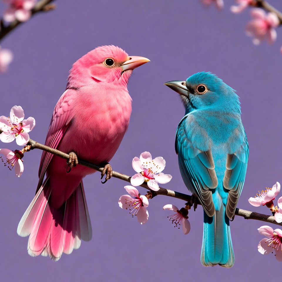 A vibrant pink parrot and a bright blue parrot perch side by side on a branch adorned with pink cherry blossoms. They face each other with detailed feathers and expressive eyes against a purple background. Delicate blossoms frame the birds, enhancing the colorful scene.