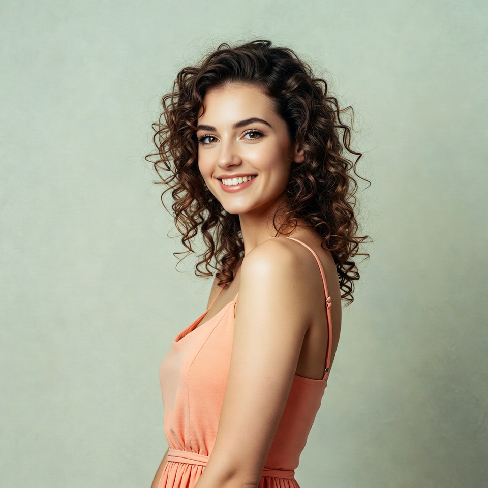 A young woman with long curly brown hair smiles warmly at the camera. She wears a sleeveless orange dress with thin straps and stands against a light green background. Her head is slightly turned, highlighting her joyful expression.