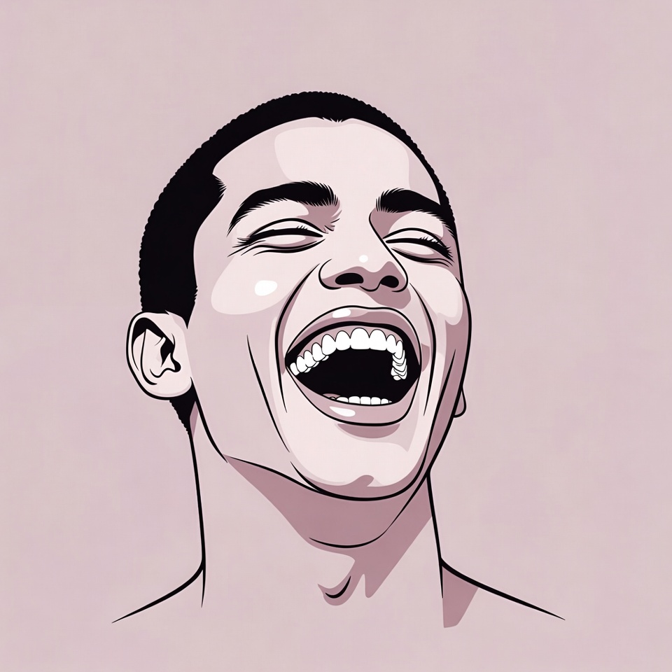 A close-up illustration of a young man with short black hair laughing heartily. His eyes are squinted shut, mouth wide open showing teeth, and face lit with joy on a light pink background. The artwork uses bold black outlines and smooth shading.