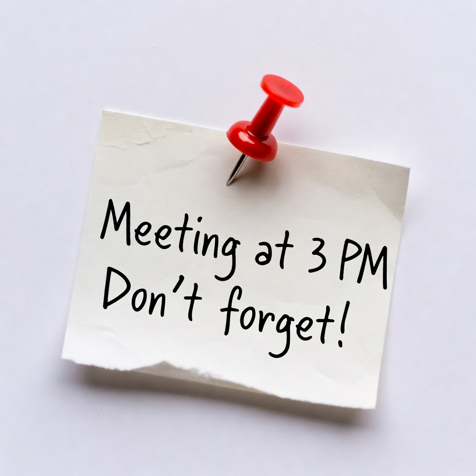 3 PM meeting, appointment reminder, bulletin board pin, don't forget, handwritten note, meeting reminder, note paper, office reminder, post-it, push pin, red pushpin, reminder note, schedule note, thumbtack, white background, sticky note