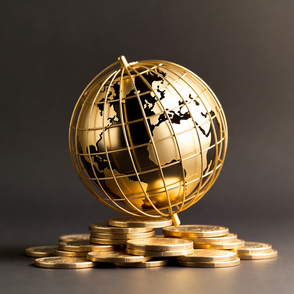 A golden wireframe globe with detailed continents sits atop a pile of stacked gold coins. The metallic sphere features a black frame against a dark gray background. The image highlights the shine and texture of the gold elements.
