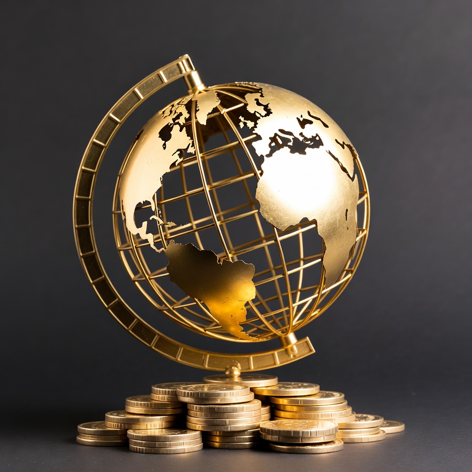A golden globe stands on a tall stack of gold coins against a dark background. The globe features a detailed wireframe design with visible continents like Europe, Africa, and South America. It is mounted on a ornate golden stand.