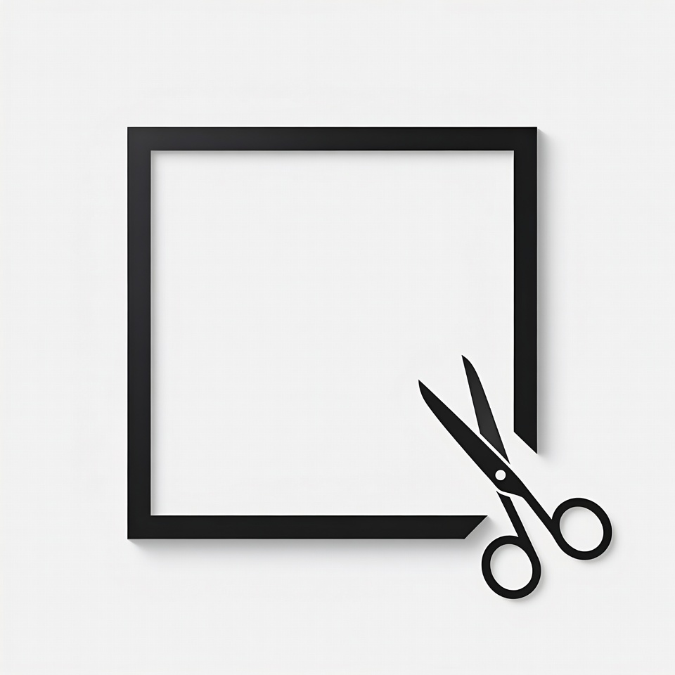A simple black line art illustration shows a square black picture frame on a white background. Large black scissors positioned at the bottom right appear to be cutting the frame. The design is minimalist and isolated.