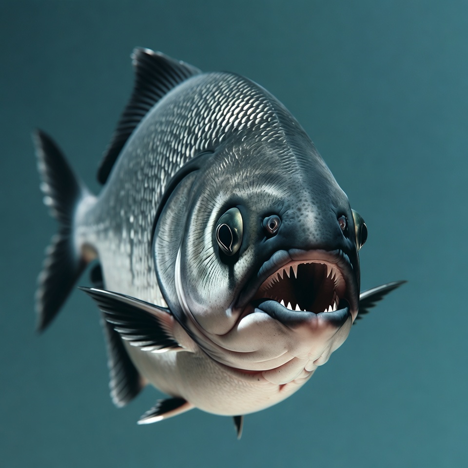 3D render, baring teeth, big eyes, blue background, bulging eyes, detailed fish, digital art, fins, fish, freshwater fish, illustration, open mouth, predatory fish, scales, sharp teeth, silver fish, underwater, bream fish