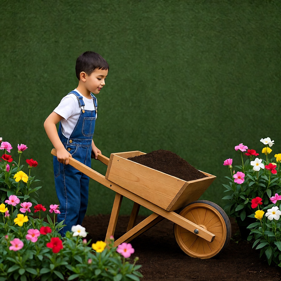 A young boy with short dark hair wears blue overalls and a white t-shirt while pushing a wooden wheelbarrow filled with dirt. He stands on a green backdrop surrounded by colorful flowers including pink, red, yellow, and white blooms. The wheelbarrow has large wooden wheels and is positioned in a gardening scene.