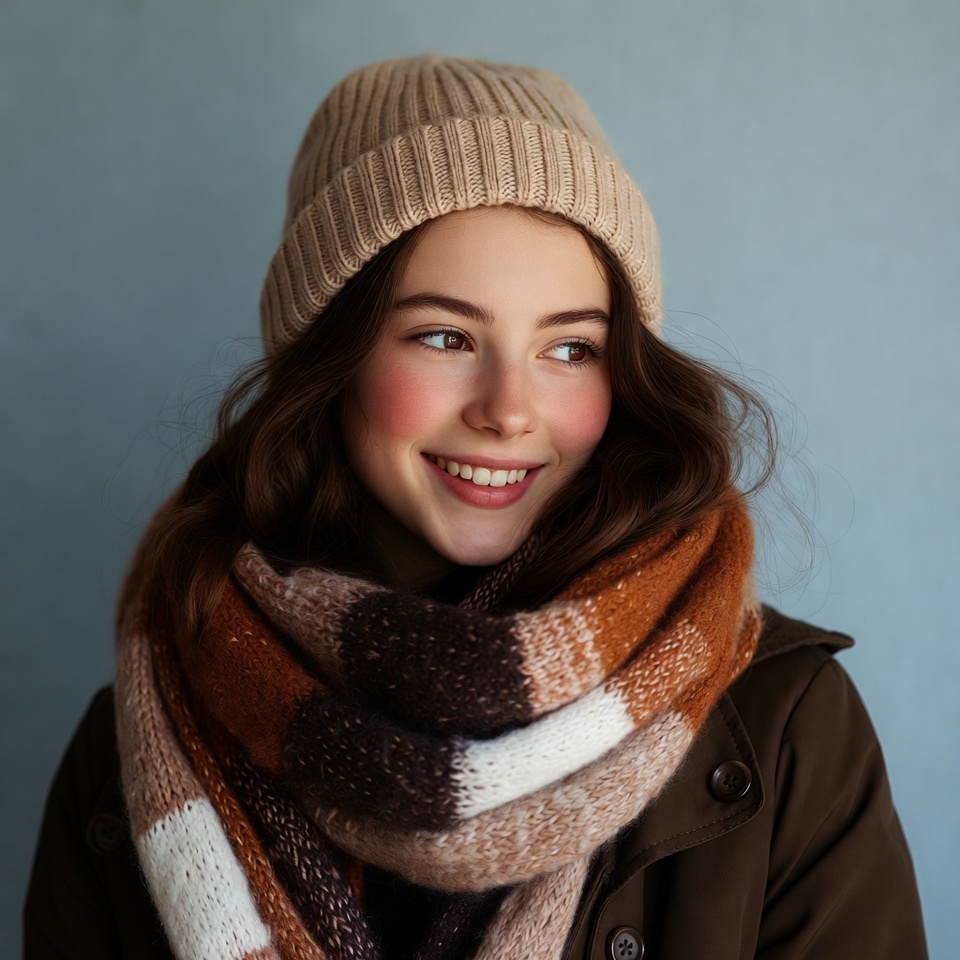 A young woman with long wavy brown hair smiles softly while looking to the side. She wears a cream-colored knit beanie, a multicolored striped scarf wrapped around her neck, and a brown coat. She stands against a solid blue background.
