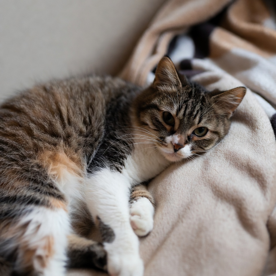 A cute tabby kitten with brown, black, and white fur lies relaxed on a soft beige bedspread. Its green eyes gaze sideways while paws are tucked under its body. The cat is nestled among folded blankets in a cozy indoor setting.