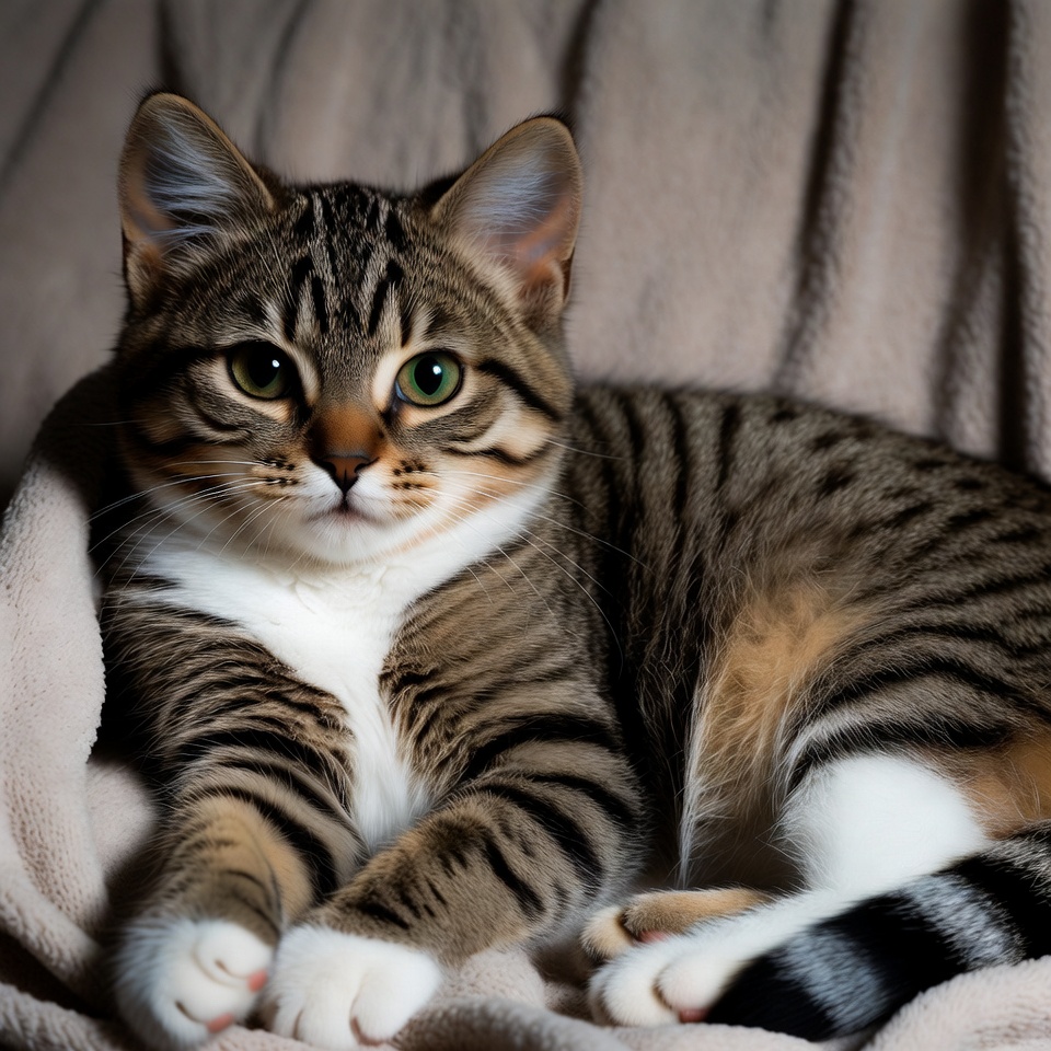 A young tabby kitten with green eyes and white paws lies relaxed on a soft beige blanket. Its striped brown and orange fur contrasts with the neutral background, and it gazes directly at the camera. The kitten's paws are tucked in front, showing its playful expression.