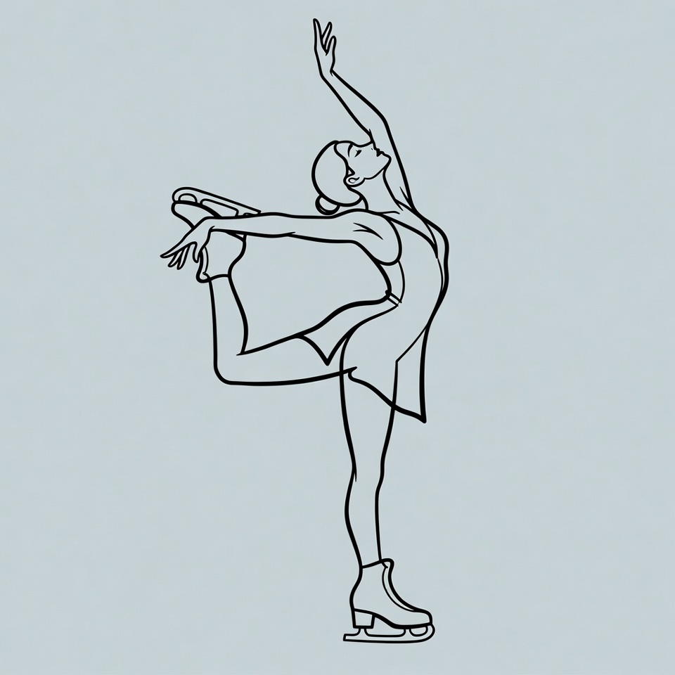 A line drawing illustration of a female figure skater in a dynamic pose with one leg raised high behind her. She wears a sleeveless dress and ice skates, with her arms extended gracefully. The image is on a plain light blue background.