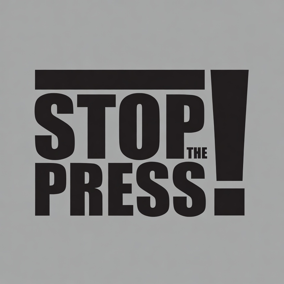 black text, bold font, clipart, exclamation mark, graphic, gray background, journalism, media, protest slogan, sans-serif, sign, stop press, warning, stop the press